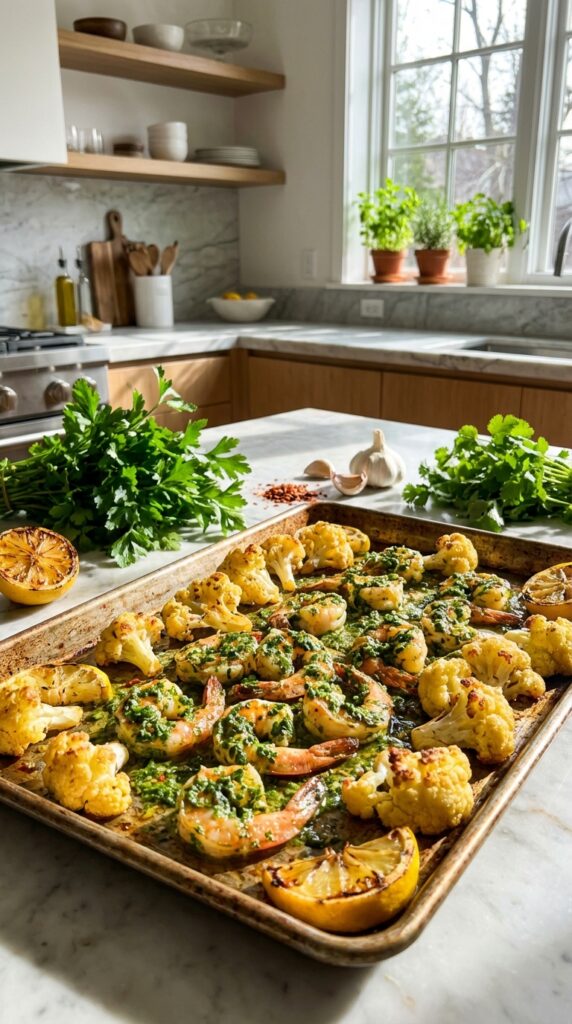 Bright chimichurri shrimp roasted with cauliflower creates a fresh, herb-packed dinner that’s light, protein-rich, and satisfying.