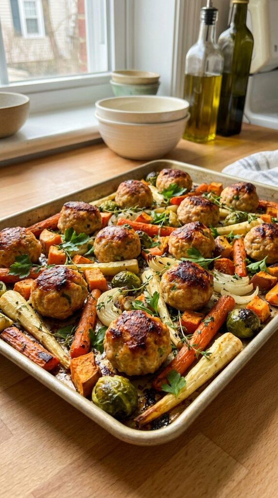 Lean turkey meatballs roast perfectly alongside seasoned vegetables, creating a wholesome, protein-rich dinner that’s both comforting and healthy.