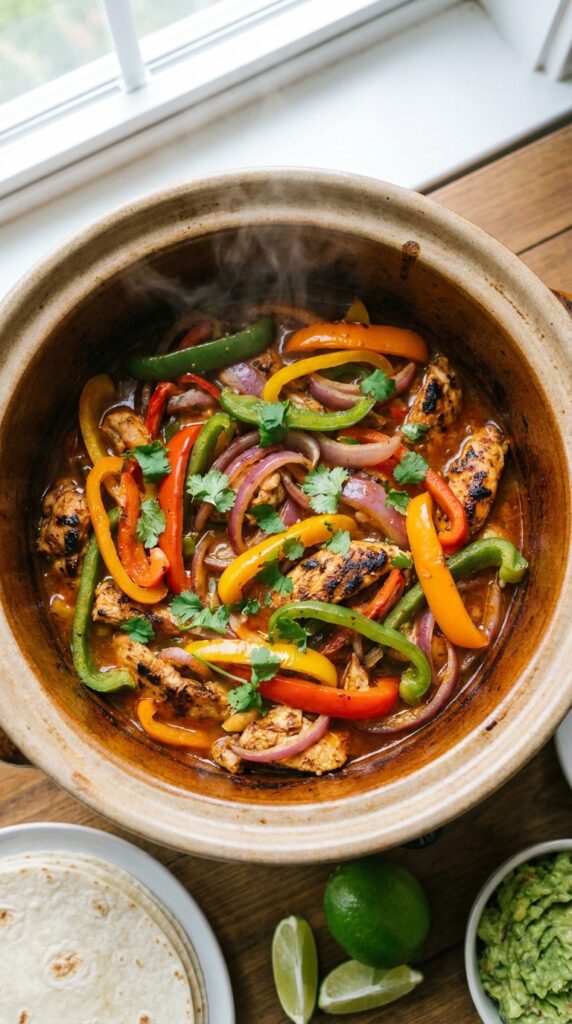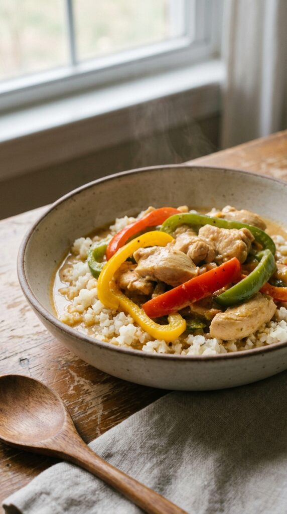 Seasoned chicken with peppers and onions creates a flavorful, low carb filling perfect for bowls or lettuce wraps.