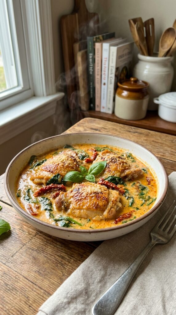 Creamy sun-dried tomatoes and spinach make this Tuscan chicken rich and satisfying without the carbs. It feels restaurant-worthy yet simple.