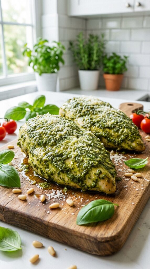 Fresh basil pesto adds rich flavor to juicy slow-cooked chicken. It’s easy, low carb, and perfect for meal prep.