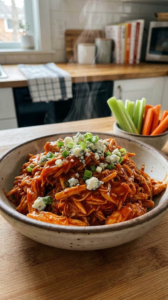 Spicy buffalo chicken becomes tender and juicy as it slow cooks. It’s perfect for lettuce wraps, salads, or low carb bowls.