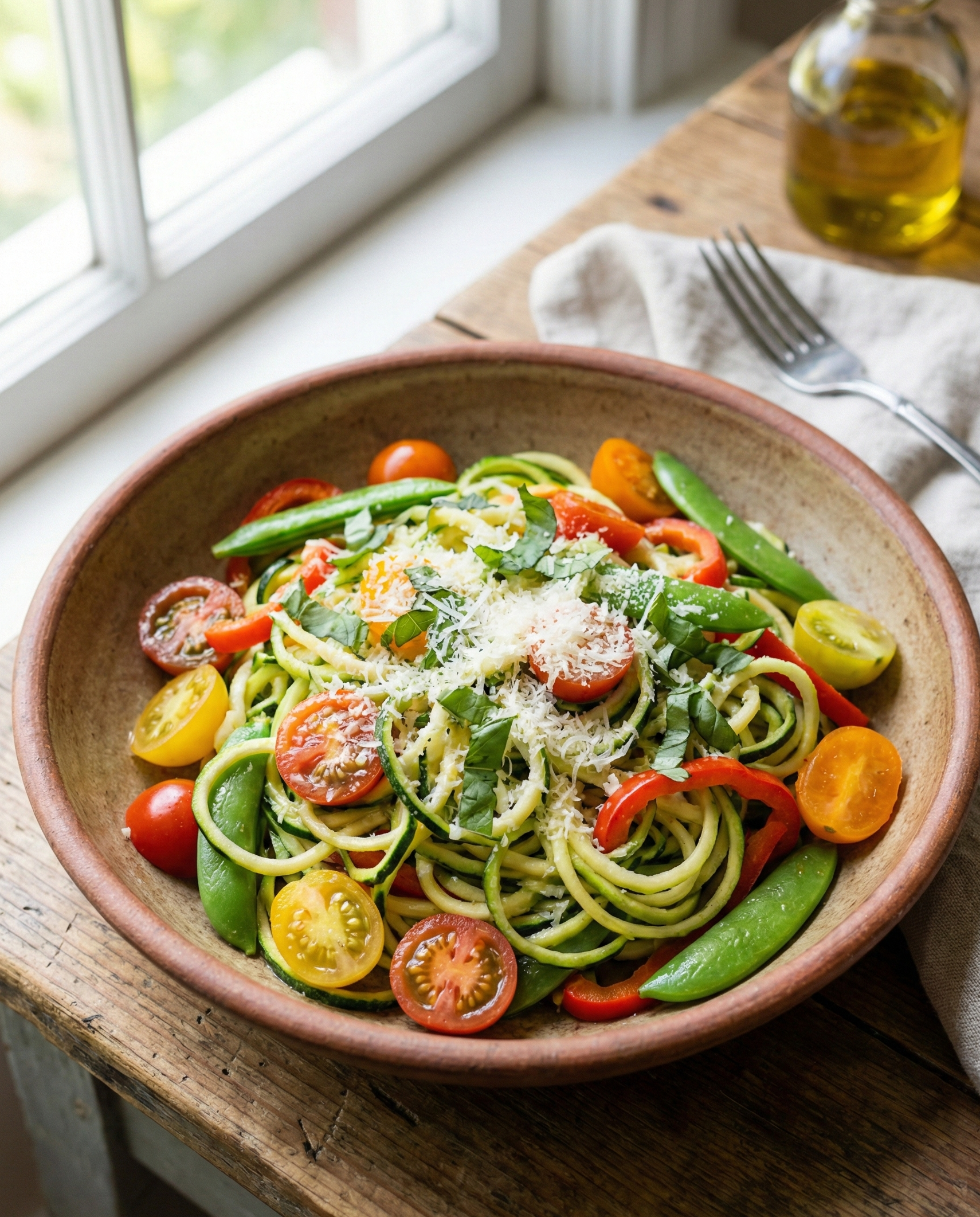 Spiralized zucchini noodles tossed with colorful spring vegetables create a light, carb-free alternative to traditional pasta. Cherry tomatoes and fresh basil add bursts of flavor throughout.