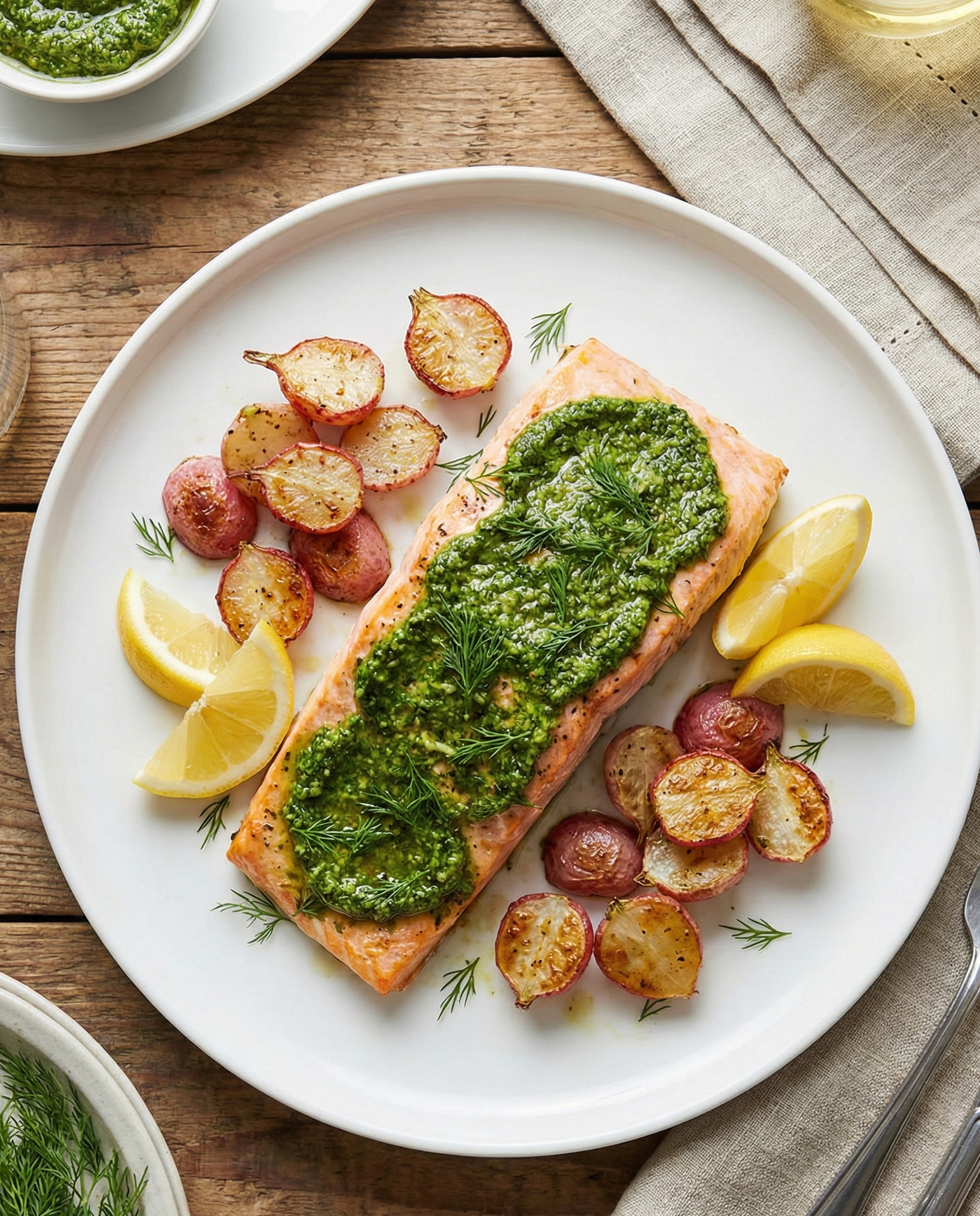 Herb-crusted salmon topped with vibrant pesto alongside roasted radishes creates an unexpected spring combination. Radishes become wonderfully mild and sweet when roasted.