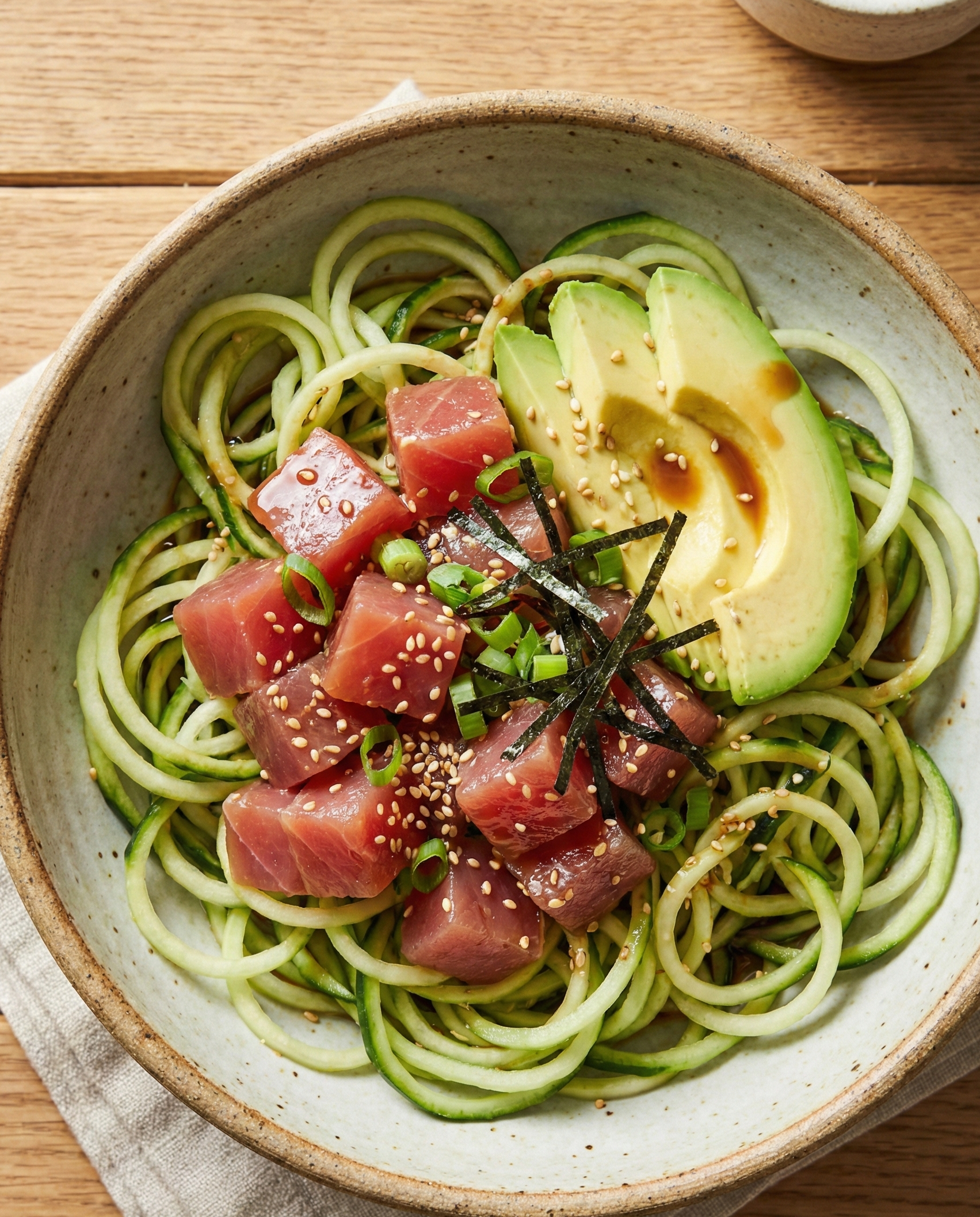 Fresh sushi-grade tuna over spiralized cucumber noodles brings Hawaiian flavors to your spring dinner. This no-cook meal is refreshing, light, and loaded with healthy omega-3s.