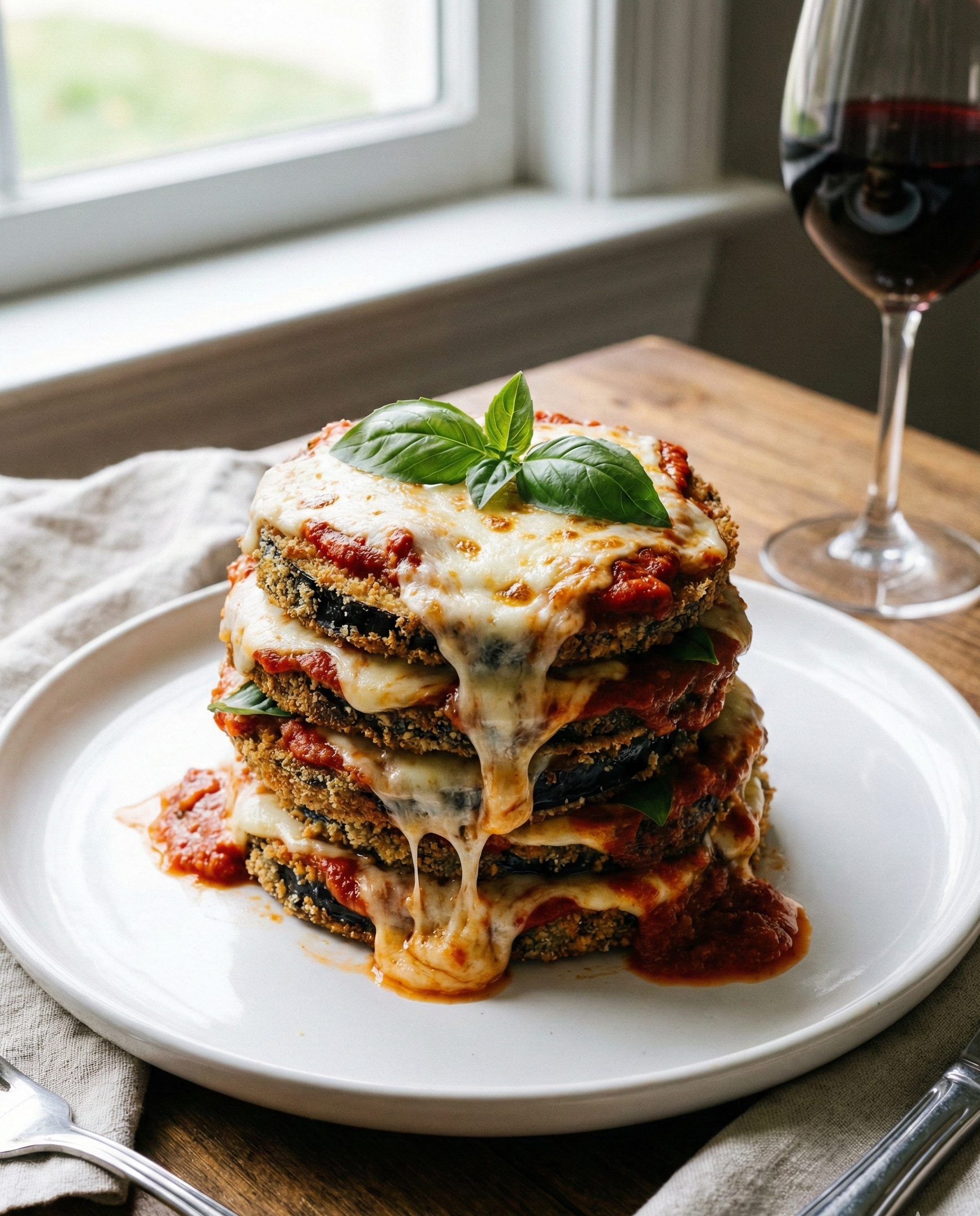 Layered eggplant rounds with marinara, mozzarella, and Parmesan create individual towers of Italian comfort. Baking instead of frying keeps this classic dish light and healthy.