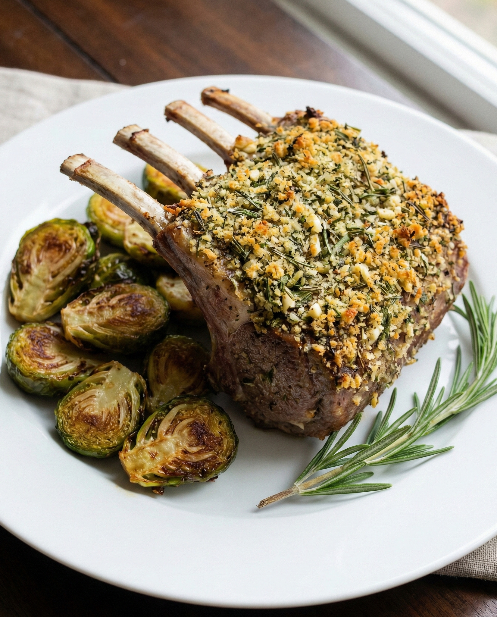14. Herb-Crusted Rack of Lamb with Roasted Brussels Sprouts