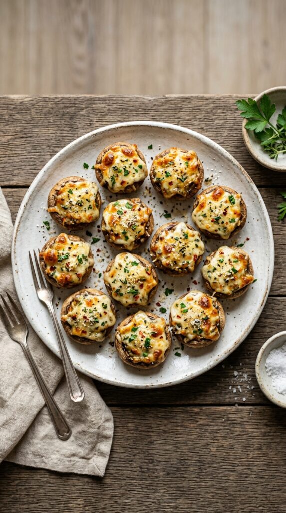 These cheesy stuffed mushrooms are rich, savory, and packed with flavor. Tender mushroom caps are filled with a creamy garlic and herb cheese mixture, then baked until golden and bubbling. They’re elegant yet simple, making them a perfect bite-sized appetizer for parties or special gatherings.