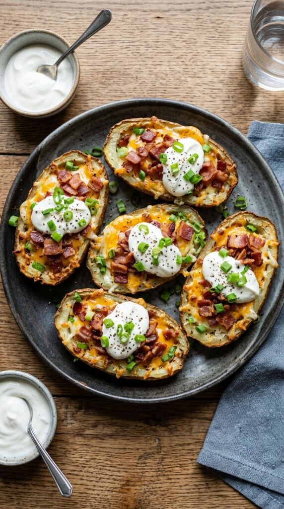 Loaded potato skins are crispy, cheesy, and packed with savory goodness. Baked potato halves are filled with melted cheese and crispy bacon, then topped with fresh garnishes. They’re hearty, flavorful, and perfect for serving as a satisfying appetizer that guests will grab again and again.