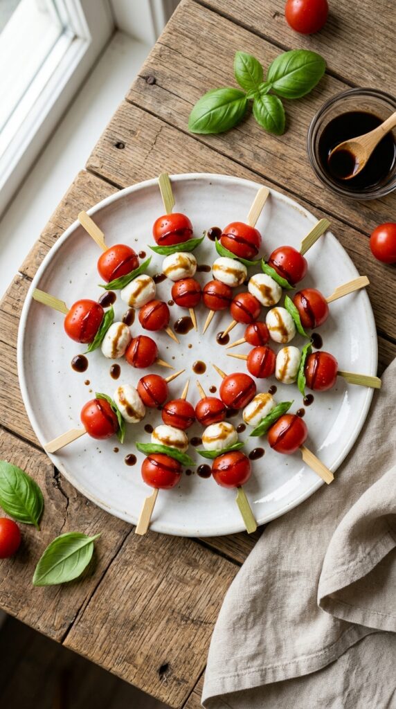 These mini Caprese skewers are fresh, colorful, and perfect for a summer celebration. Juicy tomatoes, creamy mozzarella, and fragrant basil come together for a light yet flavorful bite. Finished with a drizzle of balsamic glaze, they’re simple to assemble, visually stunning, and ideal for quick party serving without any cooking required.