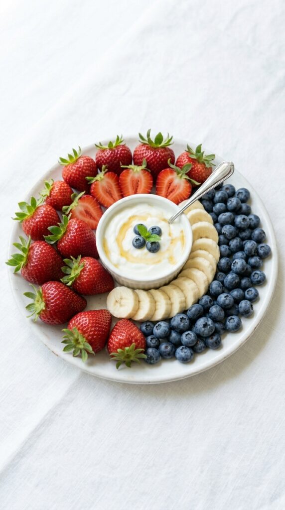 This red, white, and blue fruit platter is a fresh, healthy, and festive addition to your celebration. Packed with vibrant berries and sweet fruits, it’s both visually stunning and refreshing. Paired with a creamy yogurt dip, it offers a light, naturally sweet option that balances out heavier party appetizers perfectly.