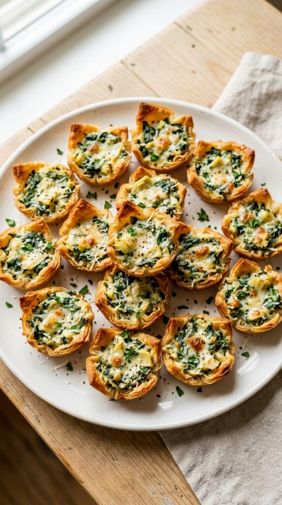 These spinach and artichoke dip bites turn a creamy classic into perfectly portioned party snacks. Rich, cheesy filling combined with tender spinach and tangy artichokes is baked into crispy, golden shells. They’re warm, comforting, and easy to serve, making them a crowd-pleasing appetizer that disappears quickly at any gathering.