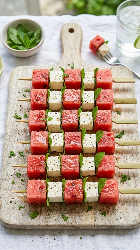 These watermelon feta skewers are refreshing, sweet, and slightly salty—perfect for hot summer days. Juicy watermelon pairs beautifully with creamy feta and fresh mint, creating a light and vibrant appetizer. Quick to assemble and visually appealing, they add a bright, fresh touch to your party spread.