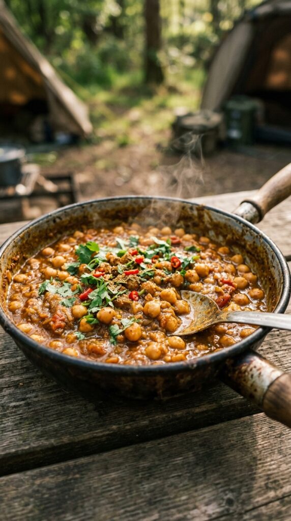 A rich and comforting chickpea curry cooked in one pan, packed with warm spices and perfect for a cozy camping dinner.