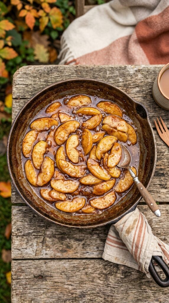 Warm apples cooked with cinnamon and sugar create a sweet, comforting one pan dessert perfect for ending your camping meal.