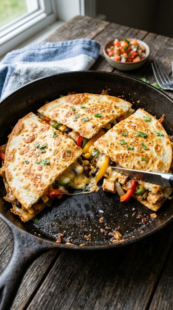 Crispy tortillas filled with melted cheese and vegetables cooked in one pan, creating a cheesy, golden, and satisfying meal.