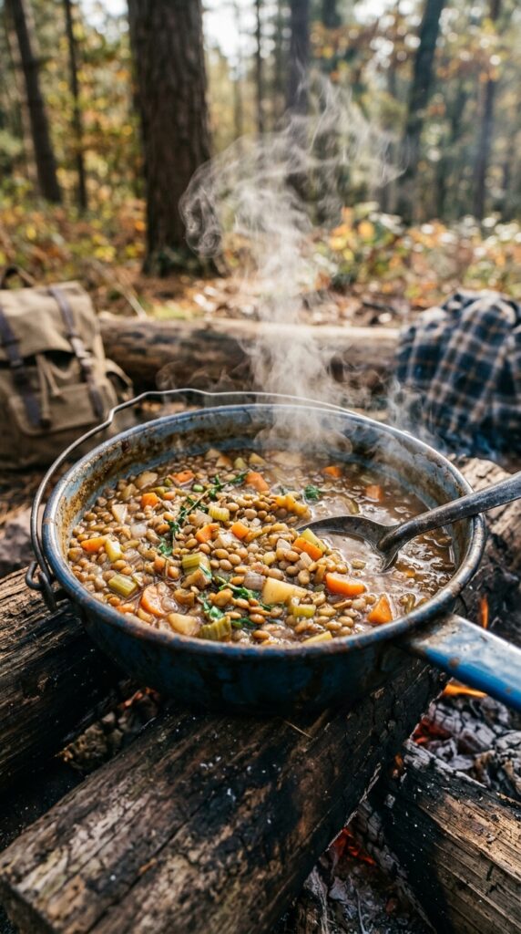 A hearty lentil stew cooked in one pan, packed with protein and warm flavors, making it perfect for chilly outdoor evenings.