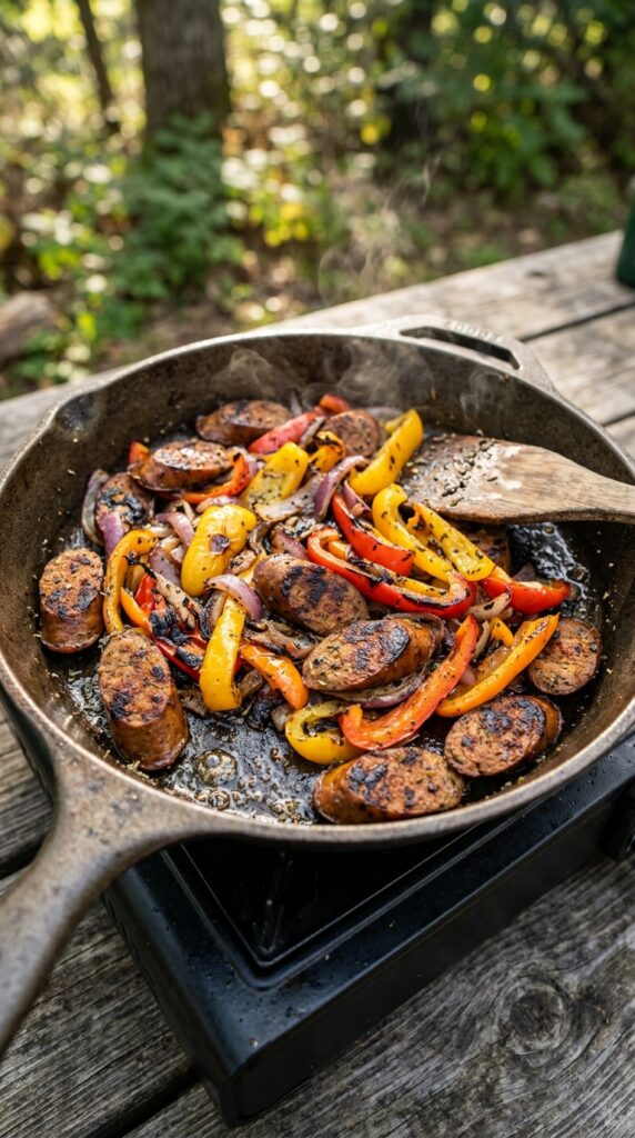 Plant-based sausages cooked with vegetables create a hearty and protein-rich meal with smoky flavors perfect for outdoor cooking.