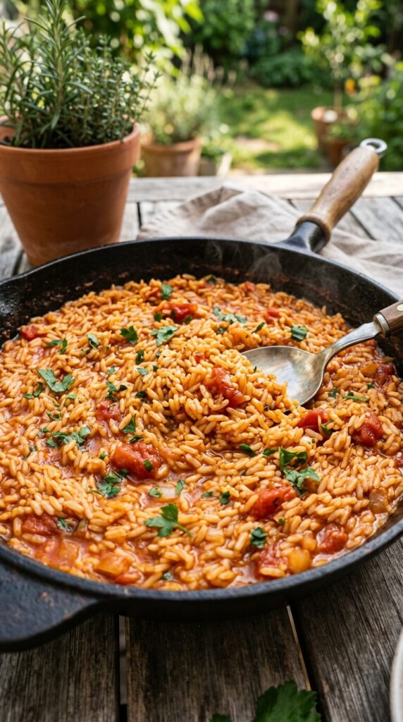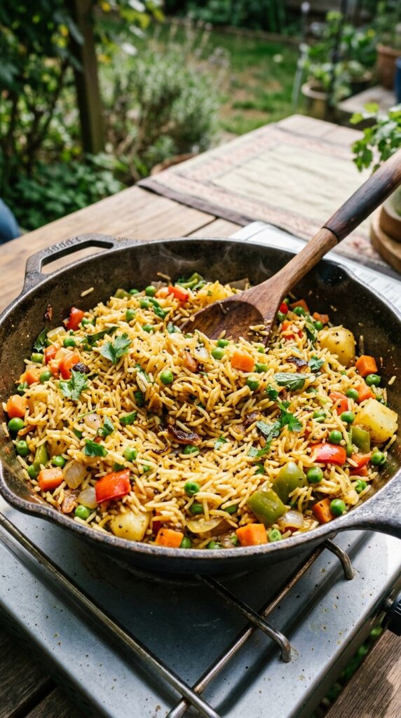 Flavorful rice cooked with spices and vegetables delivers a bold, satisfying meal that feels vibrant and filling outdoors.