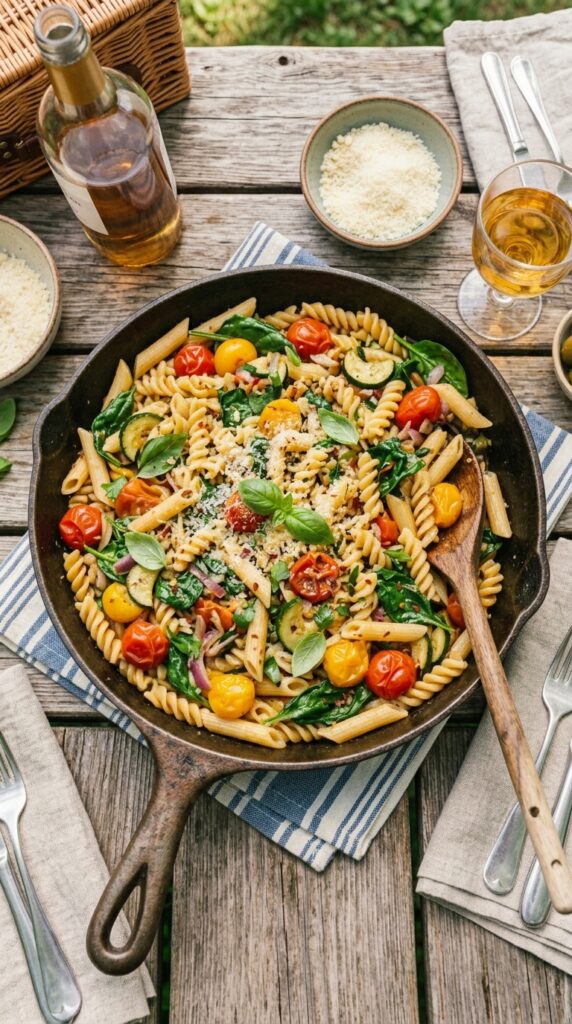 A simple pasta dish cooked in one pan with fresh vegetables, offering a cozy, filling meal with minimal effort and cleanup.