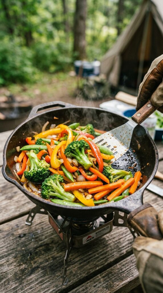A quick and colorful mix of vegetables sautéed together, delivering fresh flavors and a satisfying crunch, perfect for a simple yet nourishing camping dinner.