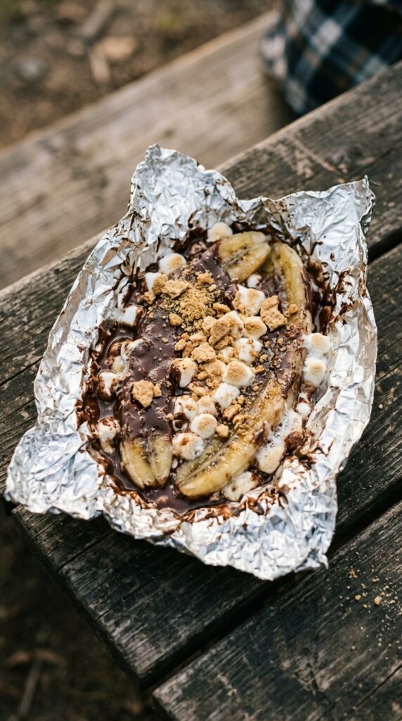 A banana becomes a dessert “bowl” filled with chocolate and marshmallows, warmed in foil until everything turns creamy, gooey, and spoonable.