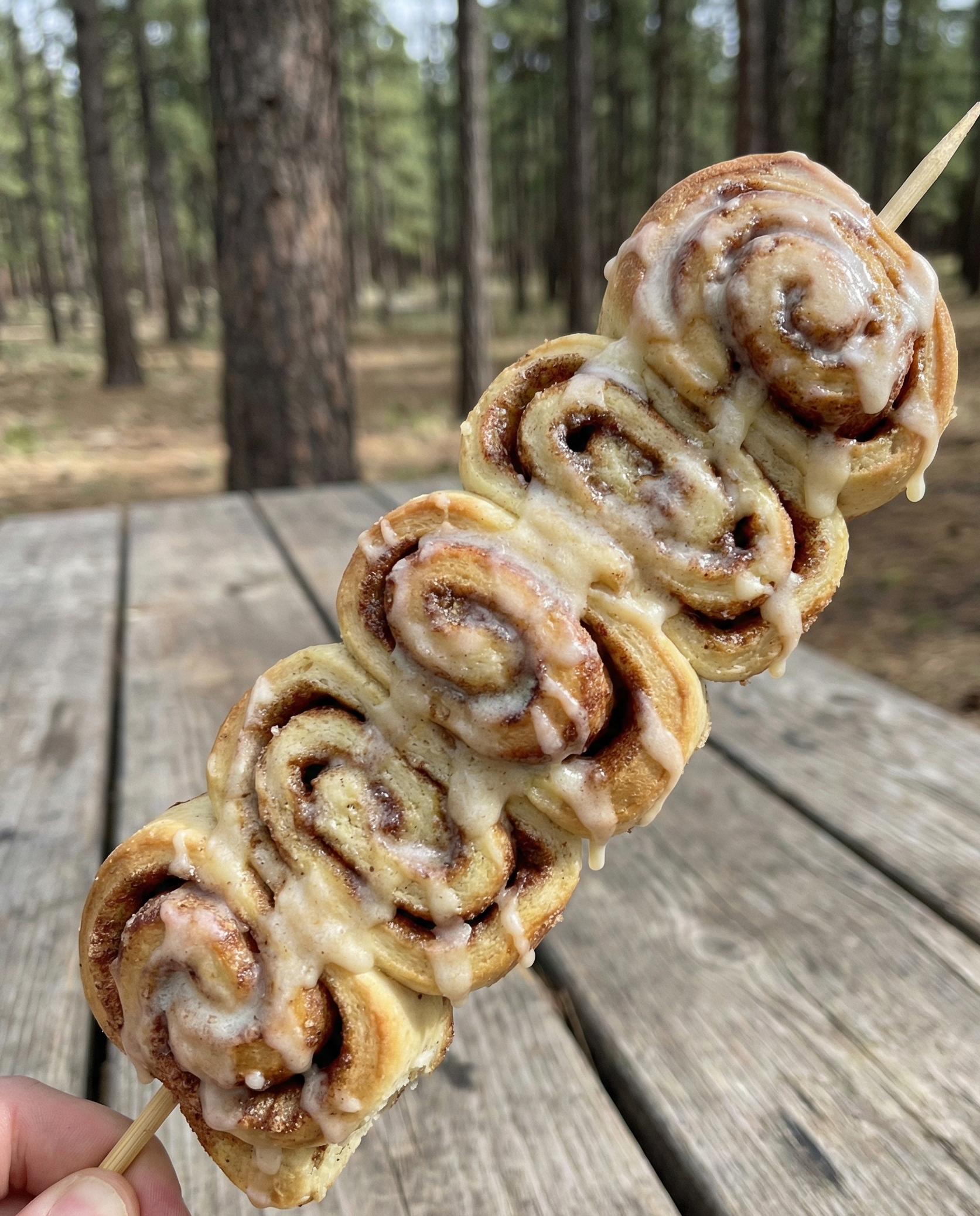 Cinnamon rolls cook on skewers like sweet bread kabobs. The outside crisps, the inside stays soft, and the icing becomes a warm drizzle.