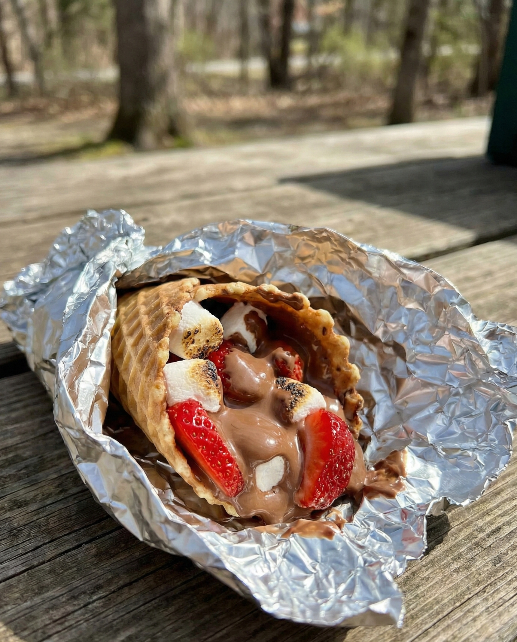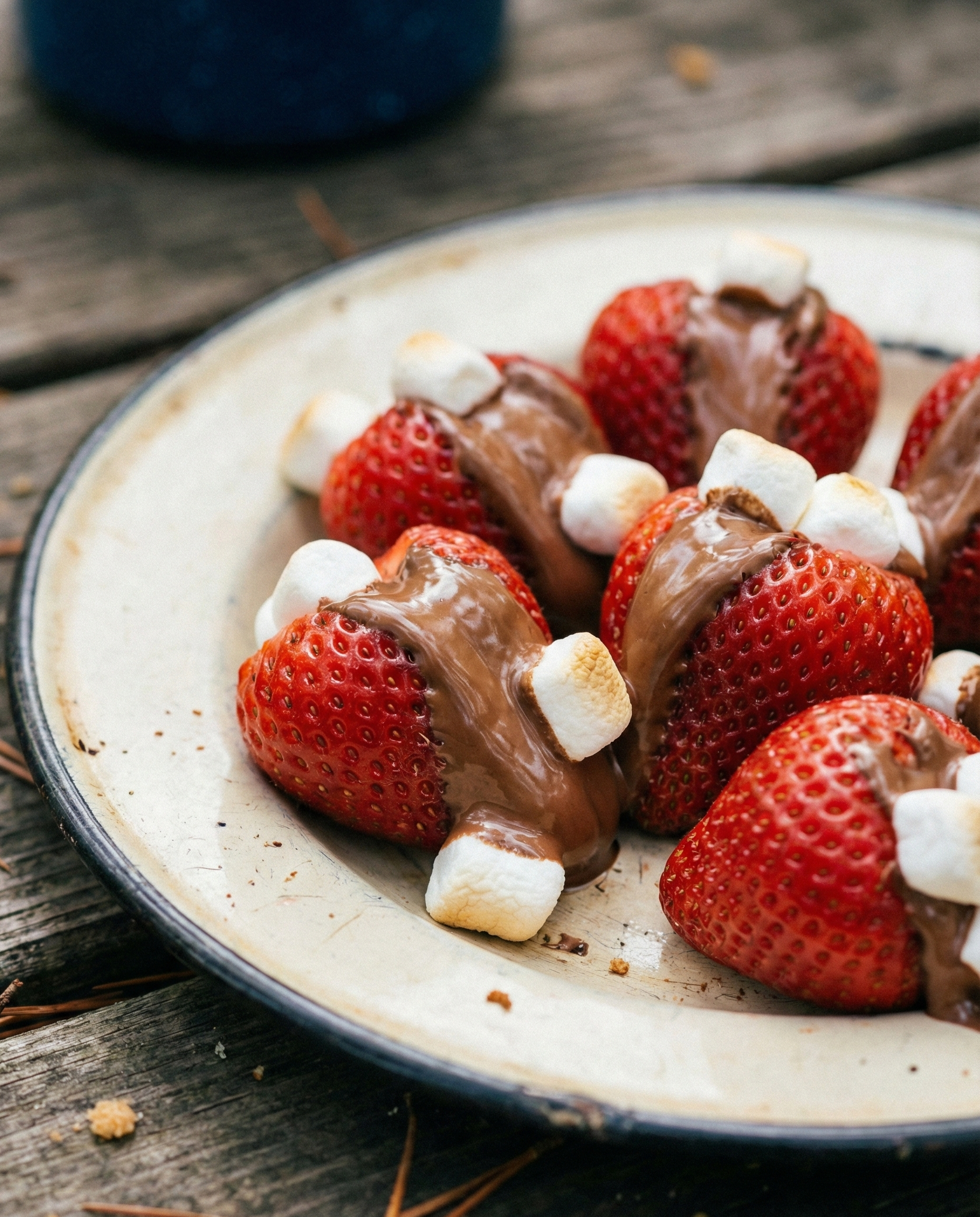 Fresh strawberries stuffed with chocolate and marshmallow soften slightly near the fire, turning into sweet, juicy bites that feel fancy but take minutes.
