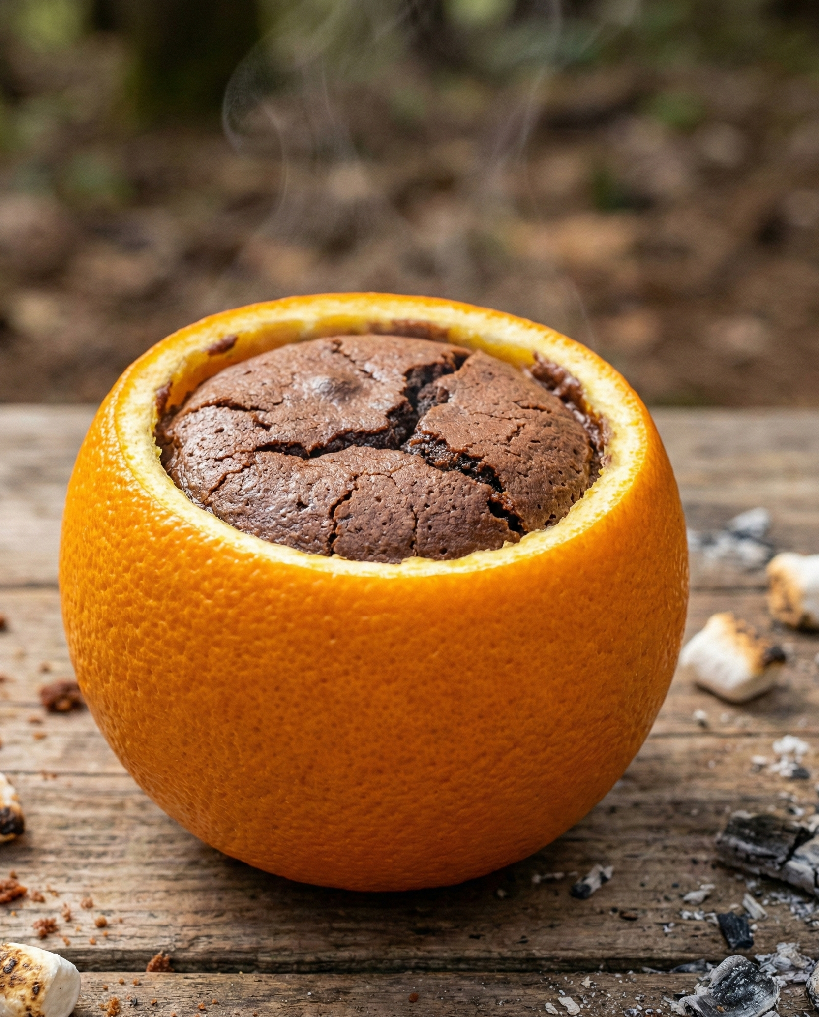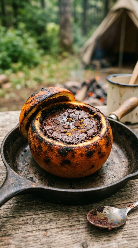 Hollowed oranges become edible baking cups. Brownie batter steams inside, picking up a bright citrus aroma that tastes surprisingly rich and cozy.