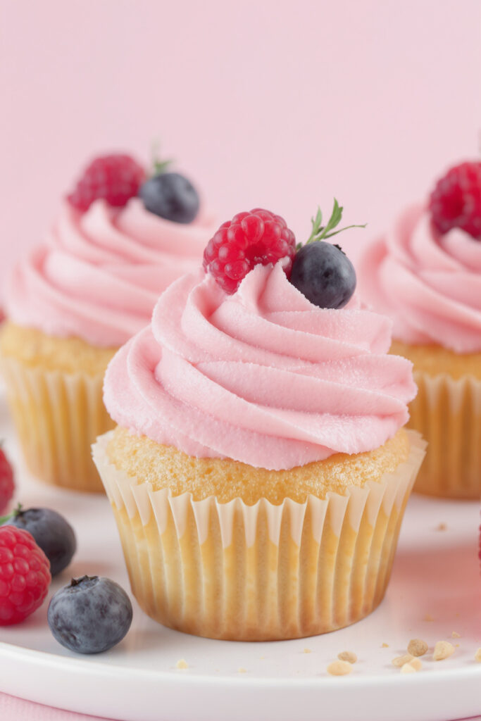 - Mix berry puree into buttercream, frost, and garnish with berries.