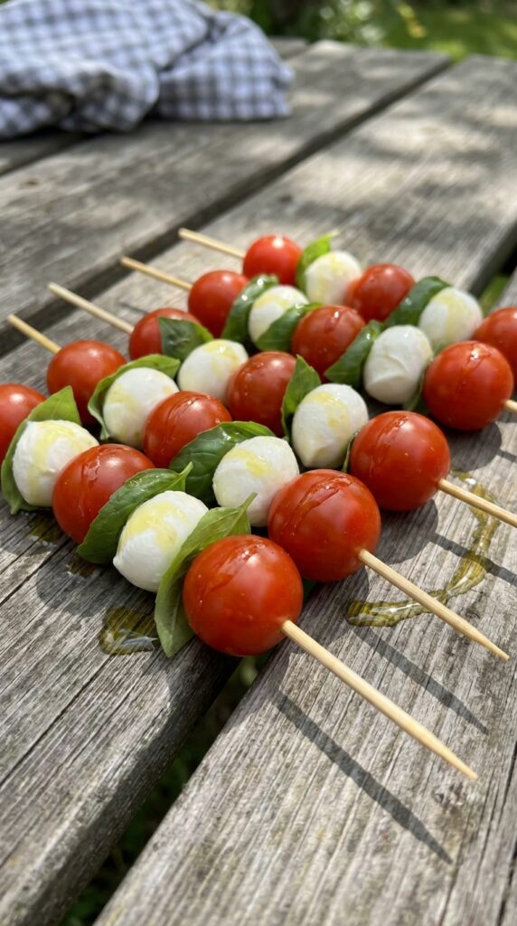 Instructions: Thread tomato, basil, and mozzarella onto skewers. Drizzle with olive oil, sprinkle salt and pepper, and chill before serving.