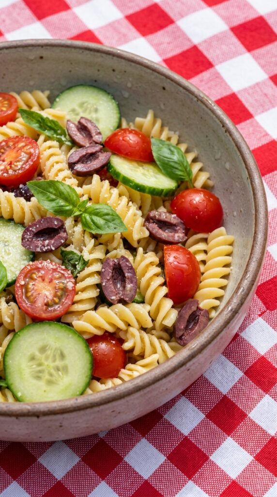 Description: A chilled pasta salad tossed with fresh vegetables and a tangy dressing is always a picnic favorite that travels well and tastes even better cold.