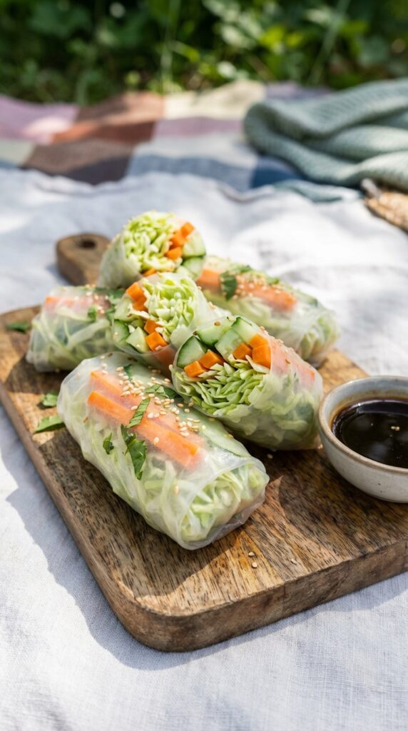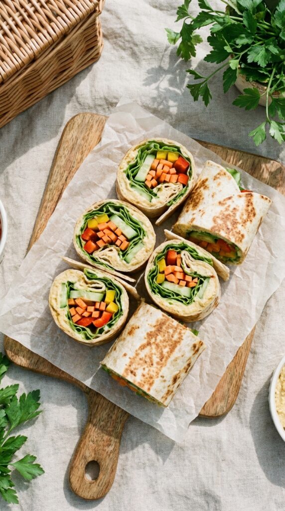 Description: Light yet filling, these wraps are loaded with crunchy vegetables and creamy spread, making them perfect for a portable, healthy picnic meal.