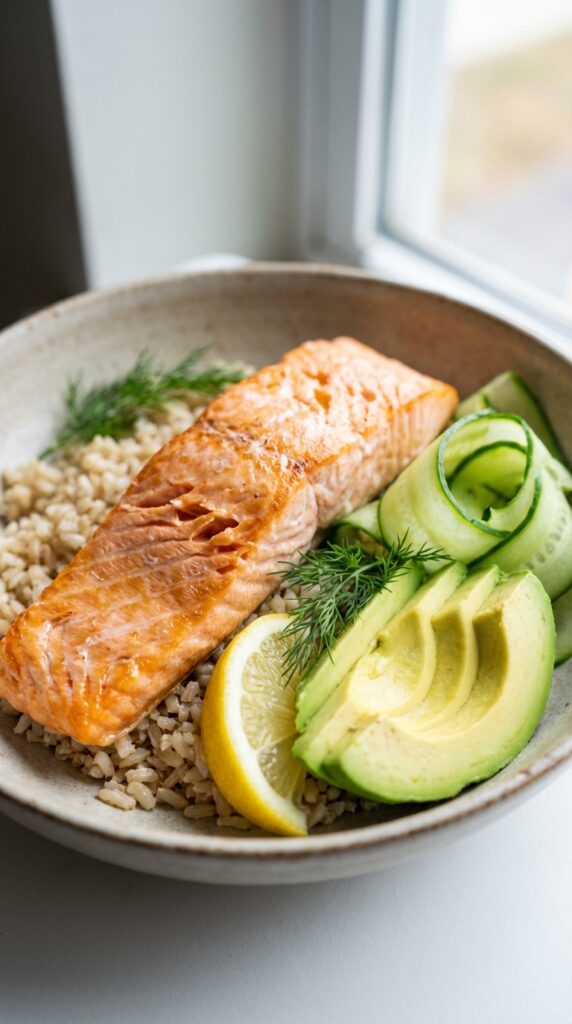 Flaky baked salmon paired with creamy avocado and hearty brown rice. A nutrient-dense bowl loaded with protein and healthy fats.
