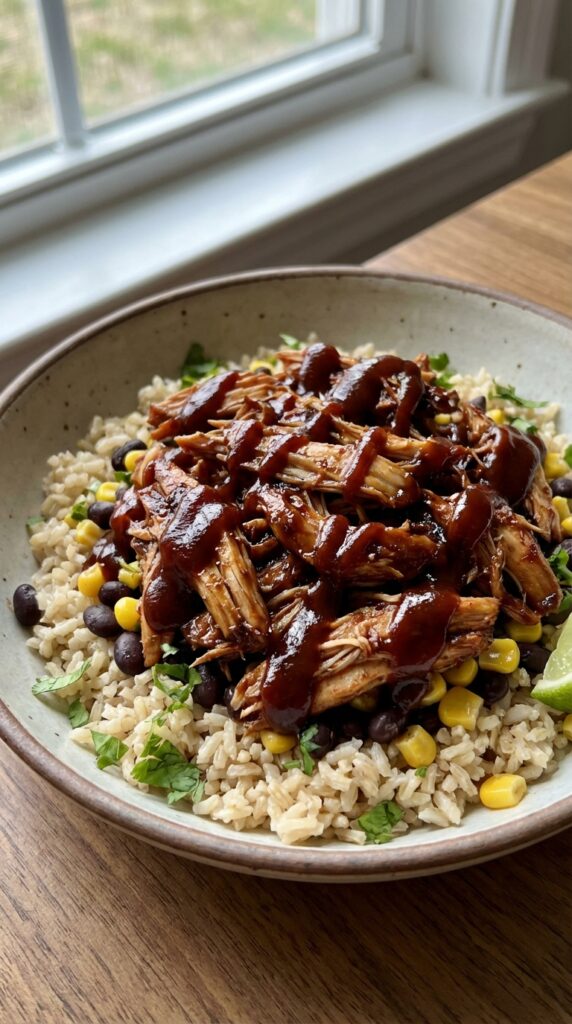 Shredded BBQ chicken layered over brown rice with corn and black beans. Comfort food flavor with a protein boost.