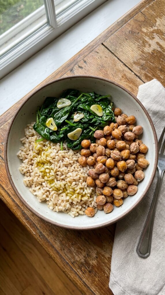 Protein-rich chickpeas combined with spinach and brown rice. A simple, budget-friendly plant-based bowl perfect for meal prep.
