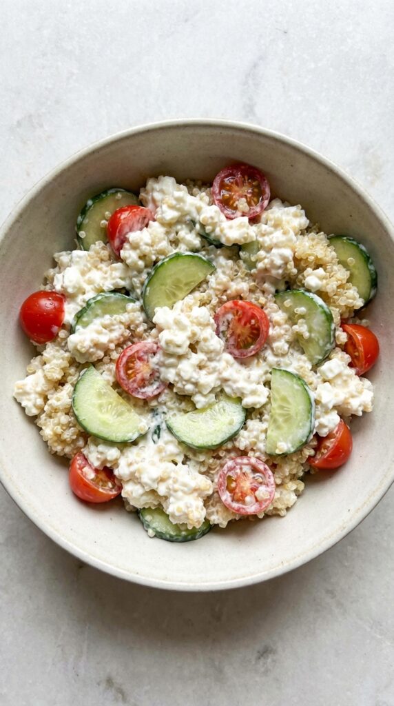 Creamy cottage cheese paired with quinoa, cucumber, and cherry tomatoes for a light yet protein-rich lunch option.