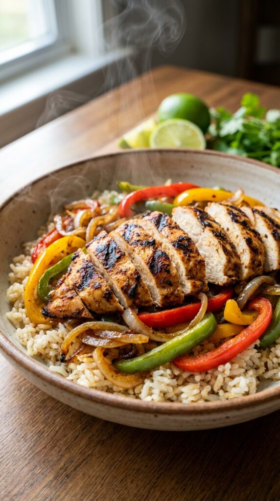 Seasoned grilled chicken with sautéed peppers and onions served over rice. A colorful, protein-packed bowl inspired by classic fajitas.