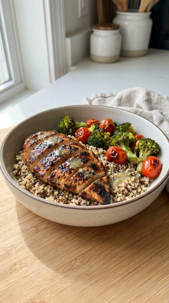 Juicy grilled chicken served over fluffy quinoa with roasted vegetables and a light lemon dressing. A balanced, protein-packed bowl perfect for meal prep.