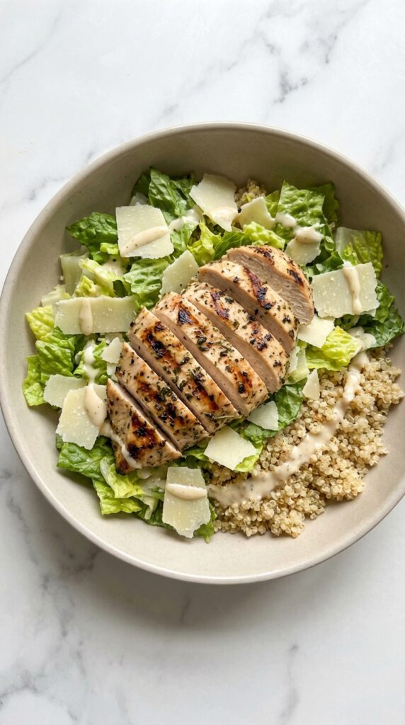 Grilled chicken, romaine lettuce, parmesan, and light Caesar dressing over quinoa for a high-protein twist on a classic salad.