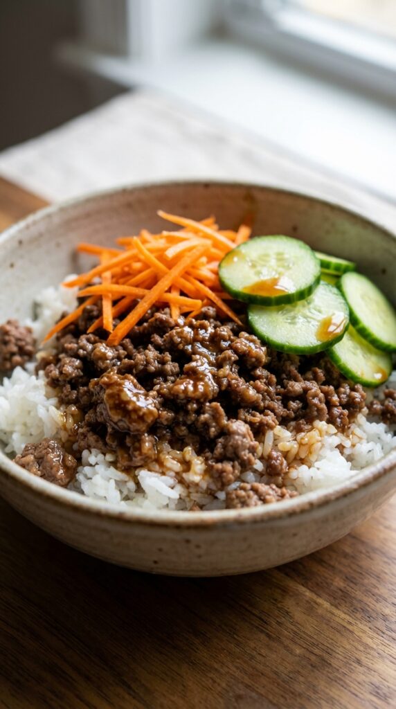 Savory ground beef cooked with garlic and soy sauce served over rice with shredded carrots and cucumber.