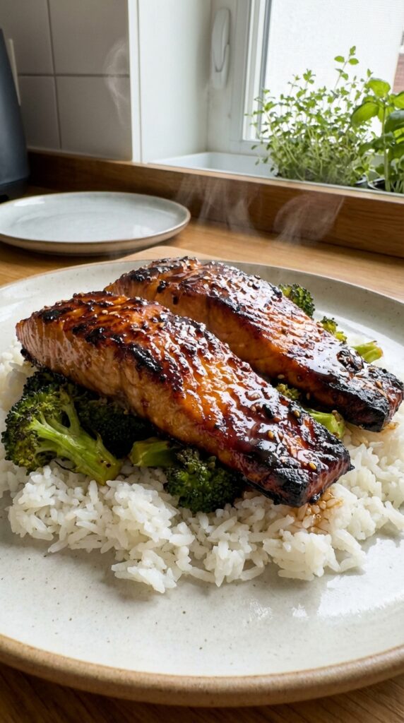 Sweet and savory salmon glazed with honey garlic sauce over rice and steamed greens. High in protein and healthy fats.