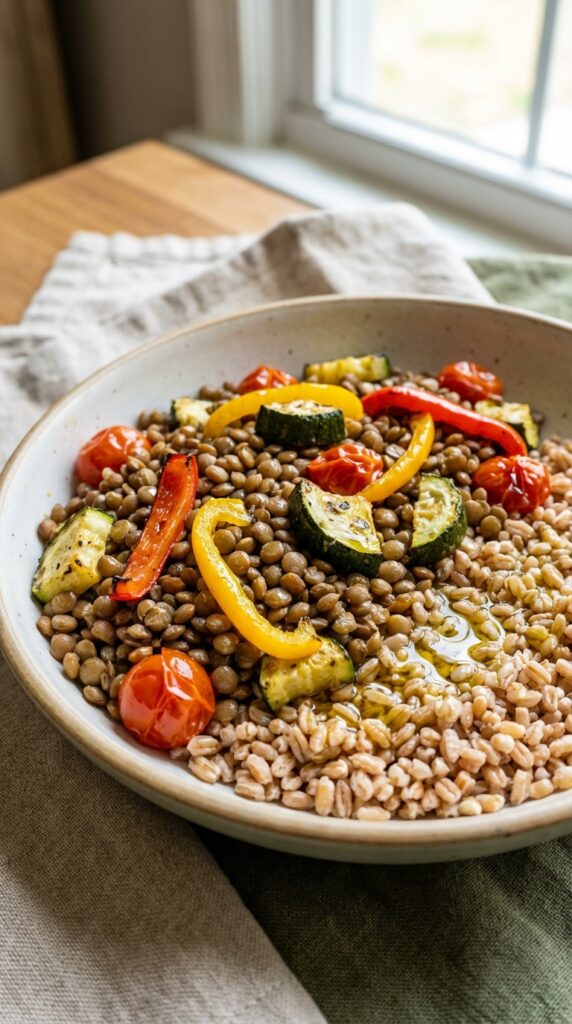 Hearty lentils combined with roasted vegetables over farro. A fiber-rich, plant-based protein bowl that keeps you full and satisfied.