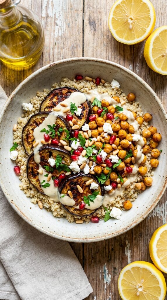 Roasted eggplant and chickpeas layered over quinoa with a lemon-tahini drizzle. A hearty plant-based protein bowl full of Mediterranean flavor.