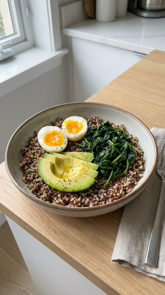 Protein-rich eggs served over quinoa with avocado and sautéed spinach. A simple yet powerful bowl perfect for midday fuel.