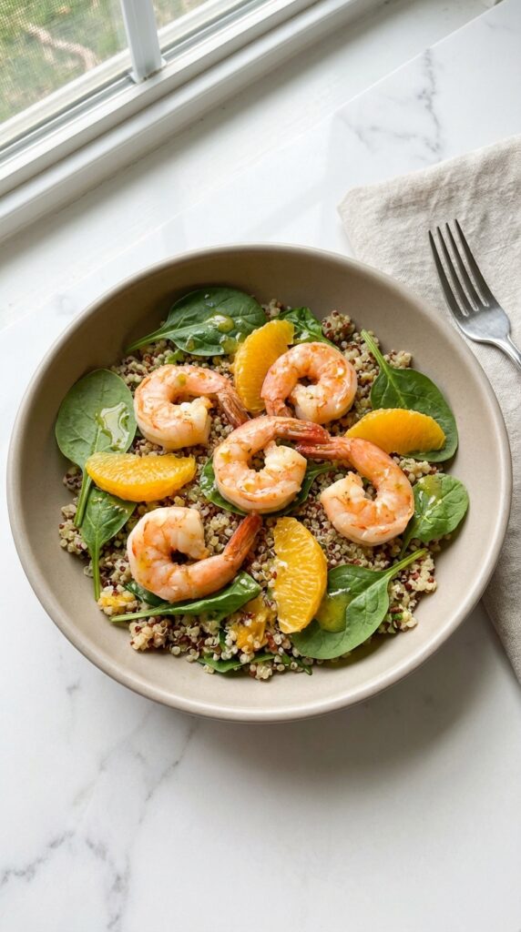 Juicy shrimp paired with quinoa and fresh greens tossed in a light citrus dressing. A refreshing, high-protein lunch option.