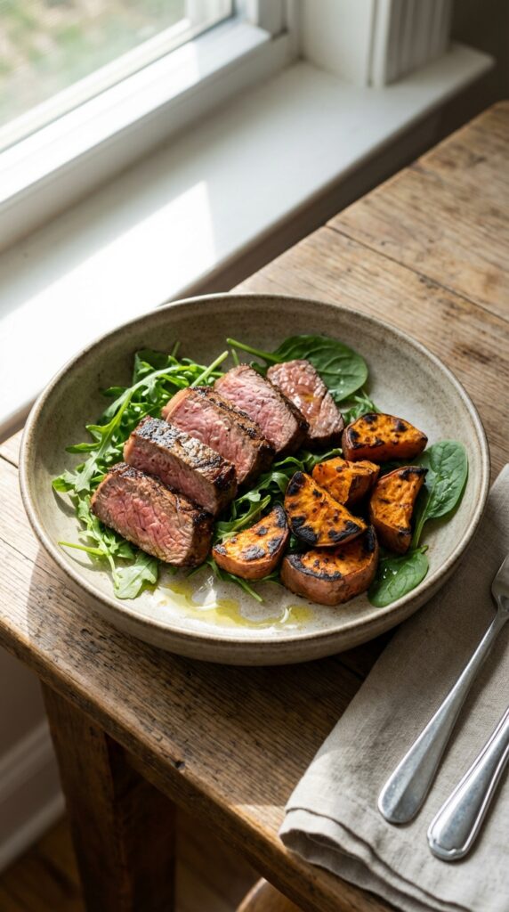Tender sliced steak served with roasted sweet potatoes and fresh greens. This hearty bowl delivers serious protein and satisfying flavor for busy afternoons.