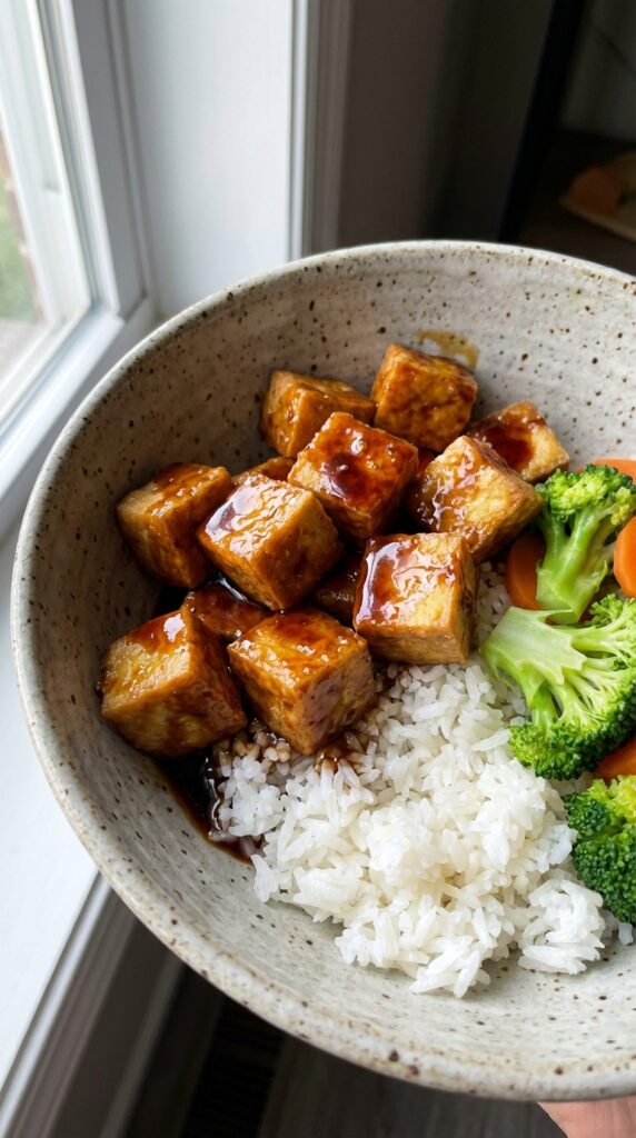 Crispy tofu glazed in teriyaki sauce served with rice and vibrant vegetables. A plant-based protein option that’s filling and flavorful.