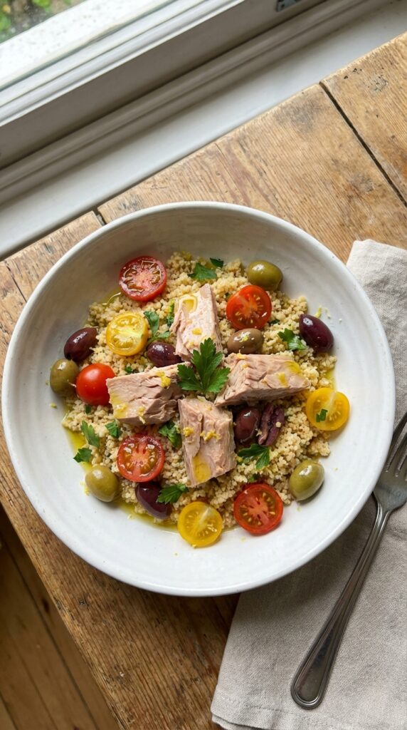 Flaky tuna served with couscous, olives, and fresh vegetables. A quick, affordable high-protein bowl with bold Mediterranean flavors.