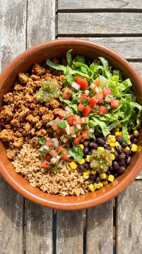 Lean ground turkey seasoned with taco spices, served over brown rice with fresh toppings. A flavorful, high-protein twist on classic tacos.